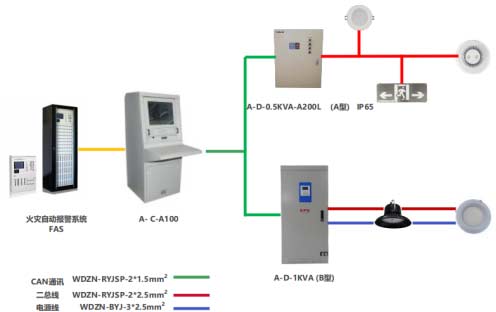本項目采用的方案是,燈具到集中電源通常二總線用法,集中電源到琴臺控制器中間使用CAN總線接法,由應急照明控制器至集中電源和分配電裝置采用手拉手接線時,通訊線長度不大于2000m,自由拓撲接線時,通訊線長度不大于500m。