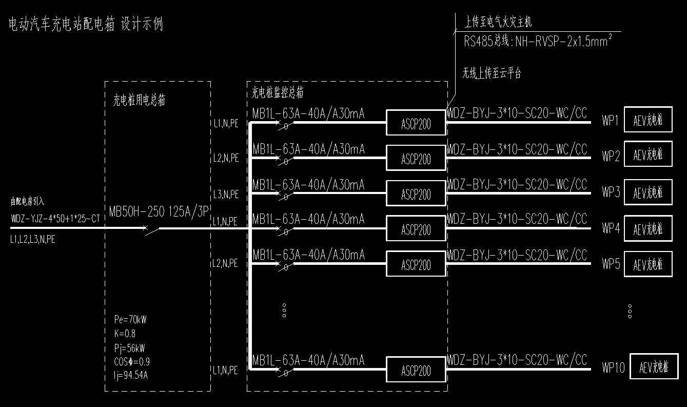 對于交流充電樁,一般是市電直接接入,按照雙槍14kW功率計算,額定電流約為63A,按照設計要求,可以在充電樁前端按照額定電流設計匹配的電氣防火限流式保護器。
