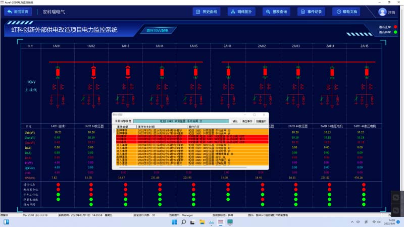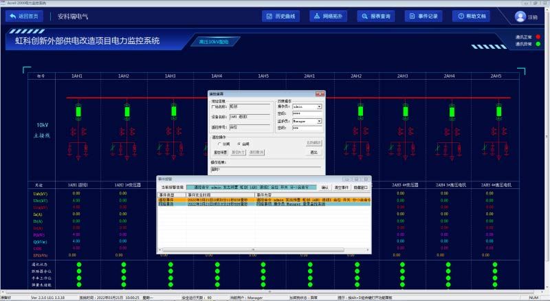 Acrel-2000電力監(jiān)控系統(tǒng)可以直觀顯示一次系統(tǒng)圖,并實時顯示10kV電壓等級各回路的遙測量、遙信量和報警信號等。遙測量包括電壓、電流、功率、功率、電能等電參量等;遙信量包括中壓開關柜內路斷路器、手車、隔離開關、負荷開關、地刀開關的分合狀態(tài)、斷路器彈簧儲能狀態(tài)及遠方就地控制狀態(tài);報警信號包括微機保護裝置的告警信號、保護跳閘信號及裝置異常信號。