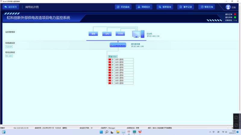 Acrel-2000電力監(jiān)控系統(tǒng)支持實時監(jiān)視接入系統(tǒng)的各設備的通信狀態(tài),能夠完整地顯示整個系統(tǒng)網絡結構;可在線診斷設備通信狀態(tài),發(fā)生網絡異常時能自動在界面上顯示故障設備或元件及其故障部位。