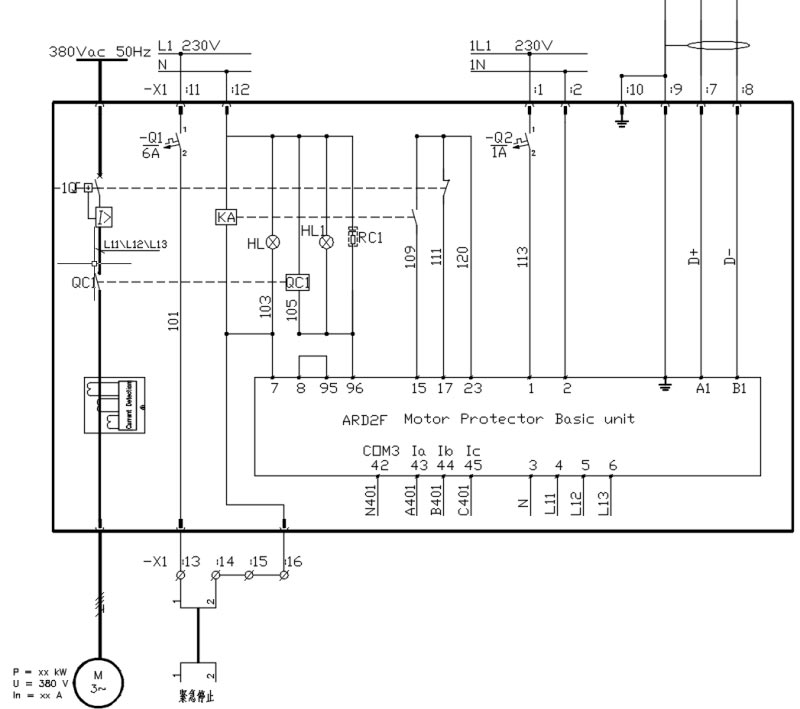 水泥廠采用保護器用于電機保護控制回路,取代熱繼電器等作為電動機的過載保護和控制元件,而且利用先進的通訊技術(shù),實現(xiàn)了水泥生產(chǎn)中電機設(shè)備控制的自動化。通過將90L顯示模塊嵌入安裝在開關(guān)抽屜的活動面板內(nèi),來簡化水泥廠控制柜內(nèi)接線,使得配電室內(nèi)設(shè)備運行情況及故障狀態(tài)清晰可見,方便工程師隨時調(diào)整系統(tǒng)、設(shè)定參數(shù)和顯示、監(jiān)控以及檢修維護。將ARD2F保護器應(yīng)用于某水泥廠生產(chǎn)線電機設(shè)備的控制回路,實現(xiàn)水泥廠對電機保護的要求。如圖2是ARD2F智能型電動機保護器應(yīng)用于某水泥廠電動機設(shè)備控制回路工作原理圖: