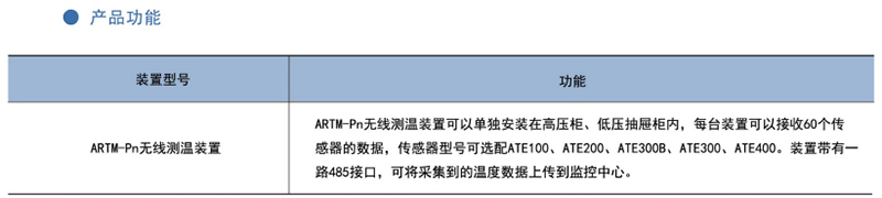 ARTM-Pn無線測溫裝置:ARTM-Pn無線測溫裝置可以單獨安裝在高壓柜、低壓抽屜柜內,每臺裝置可以接收18個傳感器的數據,傳感器型號可選配ATE100、ATE200、ATE300。裝置帶有一路485接口,可將采集到的溫度數據上傳到監控中心。