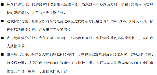 可廣泛應用于學校、醫院、商場、賓館、娛樂場所、寺廟、文物建筑、會展、住宅、倉庫、幼兒園、老年人建筑、集體宿舍、電動車充電站及租賃式商場商鋪、批發市場、集貿市場、甲乙丙類危險品庫房等各種用電場所末端干、支路的線路保護。