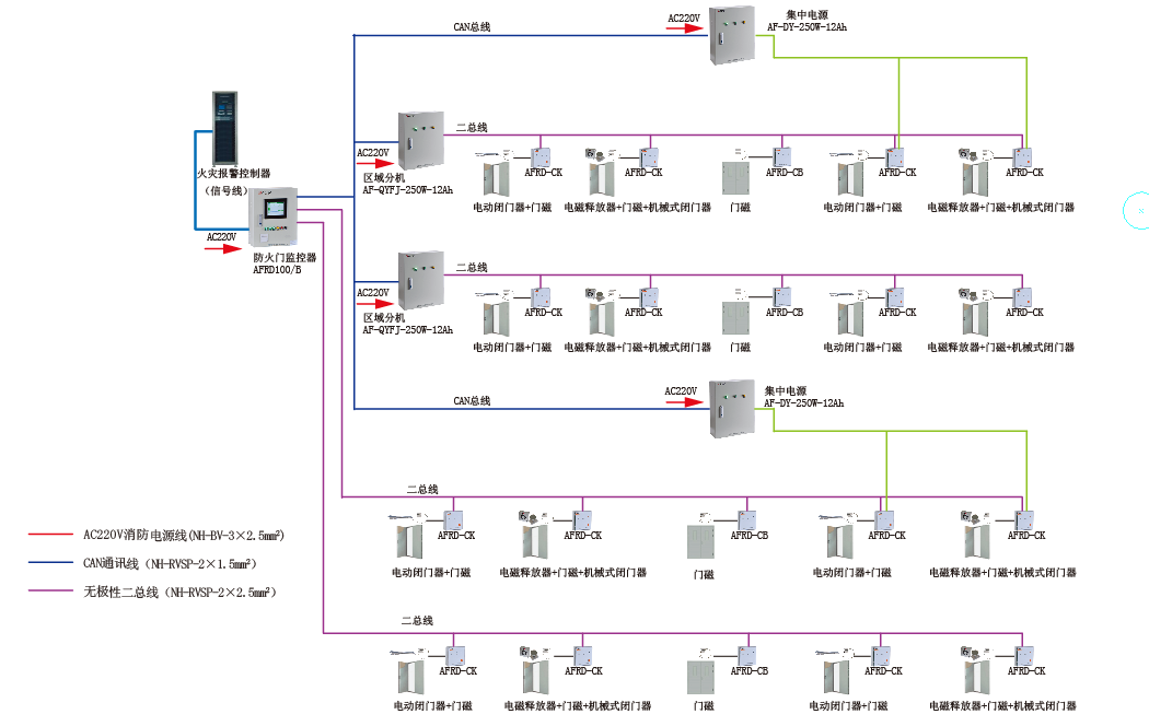 AFRD100B防火門監(jiān)控主機集中控制其各終端設(shè)備即電動閉門器、電磁釋放器的工作狀態(tài),實時監(jiān)測疏散通道防火門的開啟、關(guān)閉及故障狀態(tài),顯示終端設(shè)備開路、短路等故障信號。系統(tǒng)采用消防二總線將具有通信功能的監(jiān)控模塊相互連接起來,當終端設(shè)備發(fā)生短路、斷路等故障時,防火門監(jiān)控器能發(fā)出報警信號,能指示報警部位并保存報警信息,保障了電氣安全的可靠性。
